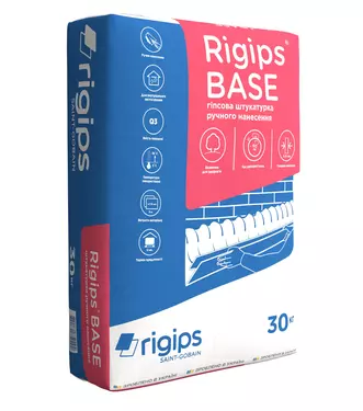 Rigips® BASE— це сучасна професійна гіпсова штукатурка, що наноситься ручним способом шаром 3-30 мм і дозволяє вирівнювати стіни всередині приміщень. Рецептура розроблена спеціально для економічної витрати до 8 кг/мкв/10 мм. Виготовлена із власної високоякісної сировини, яка забезпечує підвищенні фізико-механічні властивості.