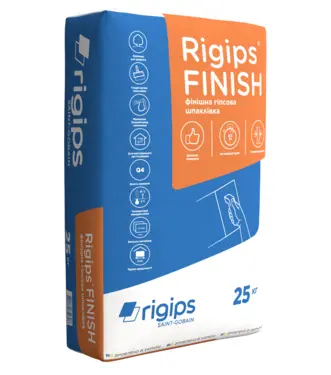 Rigips® FINISH — якісна шпаклівка на гіпсовій основі, призначена для фінішного вирівнювання внутрішніх стін і стель шаром товщиною 1-5 мм. Забезпечує гладку поверхню з мінімальними зусиллями. Це бездоганний варіант для подальшого пофарбування, поклейки шпалер або іншого декоративного покриття.