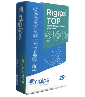 Rigips TOP — сучасна супер-фінішна гіпсова шпаклівка преміум-класу, призначена для остаточного вирівнювання внутрішніх стін і стель шаром 0,1-3мм.
